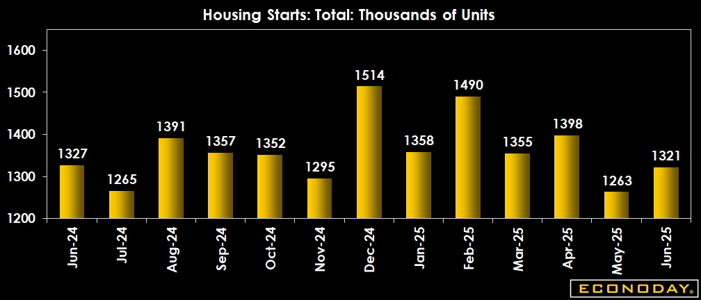 Housing starts increased as expected in June, although activity remains below the levels seen a year ago, coming in at a seasonally adjusted annual rate of 1,321,000, 4.6 percent above May's revised 1,263,000 (previously 1,256,000). Expectations in the Econoday survey of forecasters was an annual rate of 1.3 million.