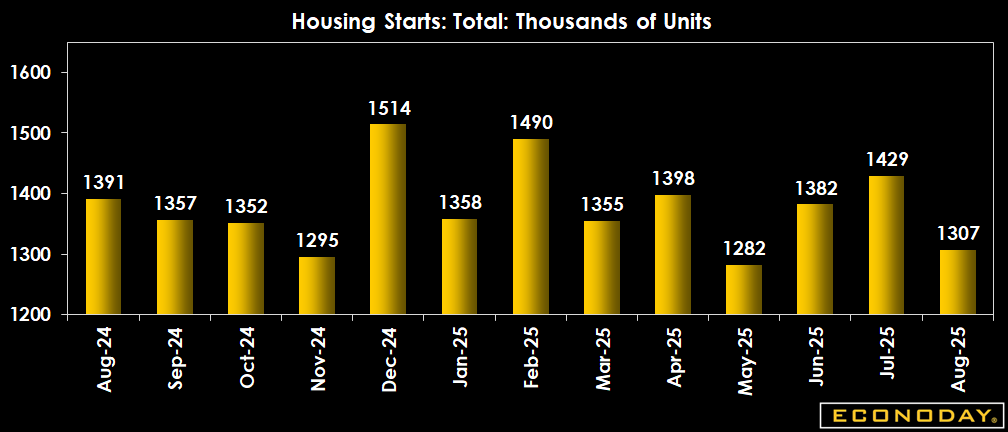 Starts of new homes are down 8.5 percent in August to a seasonally adjusted annual rate of 1.307 million units, down from a revised 1.429 million in July (1.428 million reported previously), and below the 1.370 million consensus forecast in the Econoday survey. Starts are down 6.0 percent compared to 1.391 million units in August 2024.