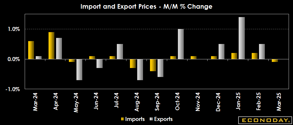 Import prices are expected flat on the month and export prices up 0.1 percent on the month in March after rising 0.4 percent and 0.1 percent in February. Note the wide range of forecasts amid diverging views on tariff effects.