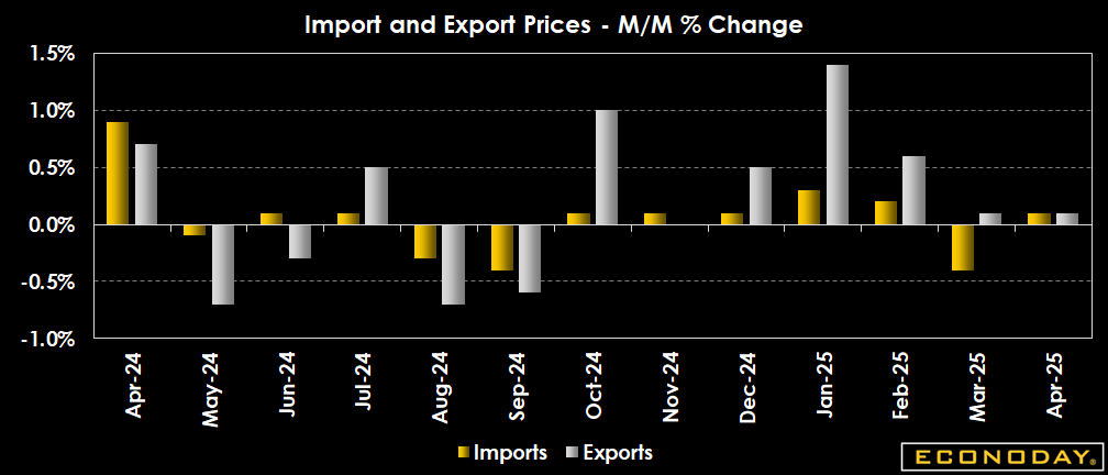 March's revised decline almost completely negates January and February's cumulative 0.5 percent rise in import prices. This, combined with April small increase, indicates little inflationary pressure from imports pre-tariffs. That might no longer be the case going forward, however, based on the jump in prices excluding fuel.