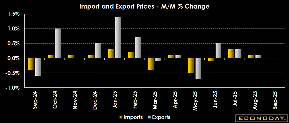 Import prices were flat in September following a 0.1 percent increase in August, while the consensus forecast in an Econoday survey had centered on a 0.2 percent decline. On a 12-month basis, import prices rose 0.3 percent after declining 0.1 percent, remaining on an upward trend since July and returning to positive territory for the first time since March of this year.