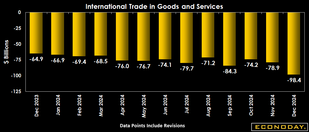 The international trade deficit for December widened sharply to $98.431 billion after $78.940 billion in November. The change is not unexpected, but larger than the consensus for a deficit of $92.0 billion in the Econoday survey of forecasters. The goods deficit is 18.2 percent greater at $122.969 billion in December, while the services surplus is down 2.3 percent to $24.448 billion.