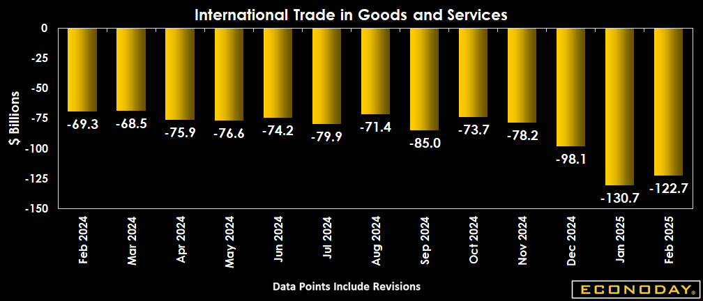 Forecasters look for goods & services trade gap at $122.7 billion in February versus $131.4 billion in January.