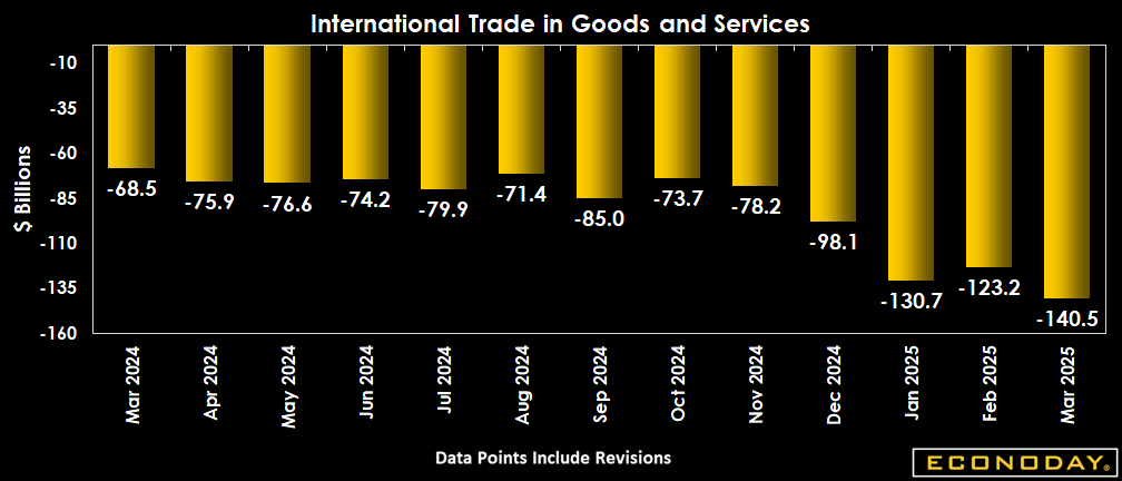 The deficit in the international trade balance in goods and services is $140.5 billion in March, wider than the consensus deficit of $136.3 billion in the Econoday survey of forecasters. The deficit for February is smaller than previously reported at $123.2 billion. Overall, the trade deficit for the first quarter 2025 means that net exports will remain a large negative contributor to growth when the second estimate of first quarter GDP is released at 8:30 ET on Thursday, May 29.