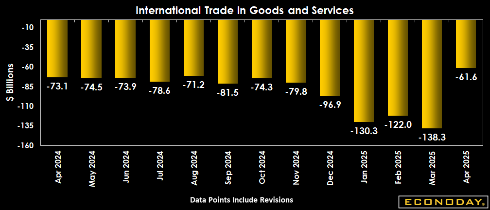 The massive narrowing in the trade deficit comes after three months in which businesses hiked imports of goods like motor vehicles and parts, consumer electronics, and pharmaceuticals to get ahead of expected punishing tariffs. These were subsequently announced in early April with some roll back later in the month. With stocks on hand increased, businesses will try to wait out unsettled trade and tariff policy and hope to see at least some reversal of the tax increases. While the April trade deficit may on the surface look like a start to less imbalance in net exports for quarterly GDP, the composition of exports and imports suggests that it may be more reflective of a slowdown in economic conditions. US business demand for goods and services is falling, while exports may be more from other countries acting while the US dollar is weaker.