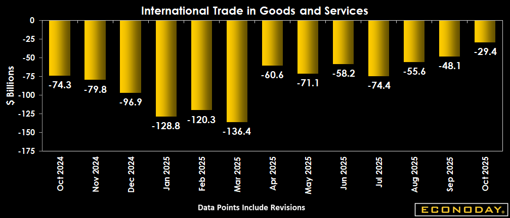 The international trade balance in goods and services is a deficit of $29.4 billion in October after a deficit of $48.1 billion in September which is a downward revision from the prior month. This is well below the consensus for a deficit of $59.1 billion in the Econoday survey of forecasters. The trade balance for goods-only is a deficit of $59.1 billion in October, down 24.5 percent from September. The trade balance for services-only is a surplus of $29.8 billion in October, down 1.2 percent from September.
