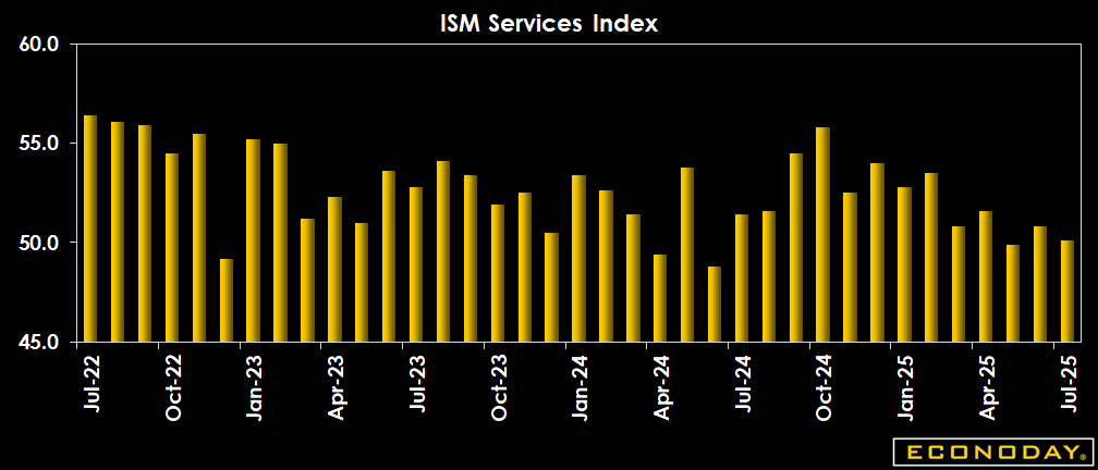 The ISM Services PMI dipped to 50.1 in July, compared to the 50.8 recorded in June, and below the 51.5 expected in the Econoday survey of forecasters.