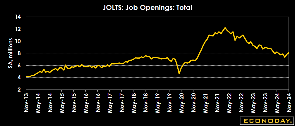 Job openings are up 259,000 in November to 8.098 million after an upward revision to 7.839 million in October. The November level is above the consensus of 7.650 million in the Econoday survey of forecasters. Job opening for private industry is up 256,000 in part on substantial gains of 114,000 in financial activities and 273,000 in professional and business services with sizeable declines of 83,000 in leisure and hospitality, 89,000 in information, and 56,000 in manufacturing. The job openings rate is 4.8 in November, the highest in six months.