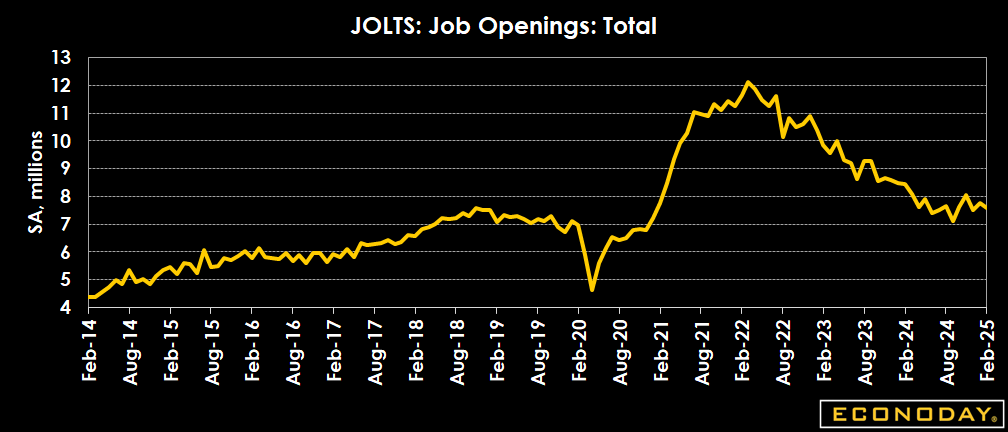 The data on job openings and labor turnover (JOLTS) in February suggests further cooling in the labor market. The number of job openings is down for the third month in a row to 7.568 million at a seasonally adjusted annual rate after a small upward revision to 7.762 million in January. The February level is close to the consensus of 7.600 million in the Econoday survey of forecasters. While the level of job openings is consistent with a healthy labor market, the trend points to sustained deceleration. In February 2024, the level was 8.445 million. The job opening rate is 4.5 in February after 4.7 in January, and down six-tenths from 5.1 in February 2024.