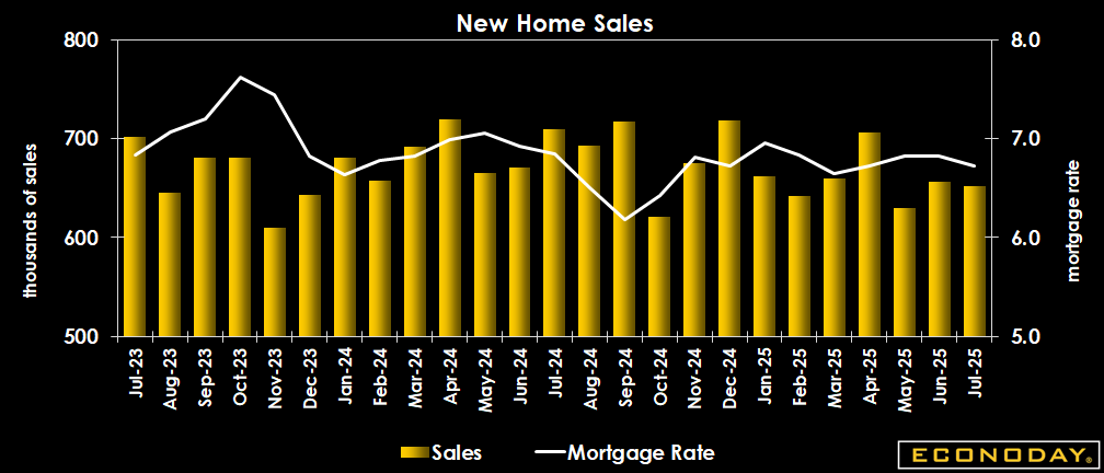 Sales of new single-family houses in July are estimated at a 652,000 annual rate, a slight dip from the revised 656,000 reported for June (previously 627,000), but beating the 628,000 expected in the Econoday survey of forecasters.