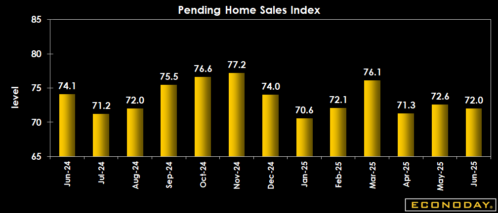 The NAR pending home sales index is down 0.8 percent to 72.0 in June after 72.6 in May. The June consensus is for up 0.2 percent in the Econoday survey of forecasters. The small change suggests that existing home sales are unlikely to pick up in July when the time comes to close contracts.