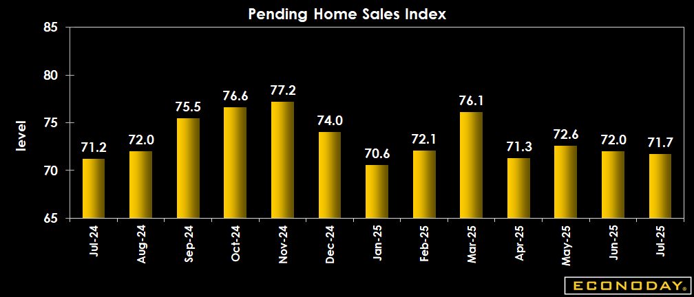 The NAR pending home sales index is down 0.4 percent to 71.7 in July from 72.0 in June. The July consensus was for a 0.2 percent uptick in the Econoday survey of forecasters. This is the second straight monthly drop and indicates existing home sales are unlikely to rebound in August when the time comes to close contracts.