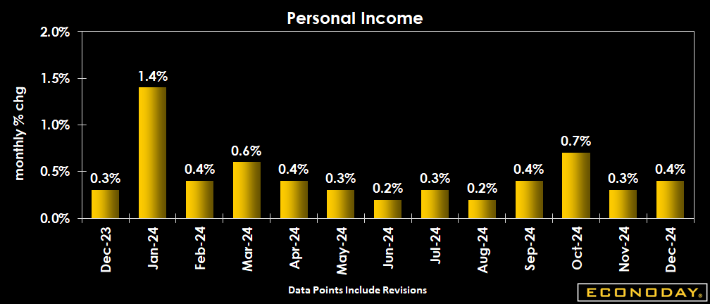 U.S. personal income rose by 0.4 percent in December, compared to a 0.3 percent increase in November and matching expectations for a 0.4 percent rise in the Econoday survey of forecasters. Consumer spending, as measured by the Personal Consumption Expenditures (PCE) index, ramped up by 0.7 percent last month following a revised 0.6 percent increase in November (previously +0.4 percent).