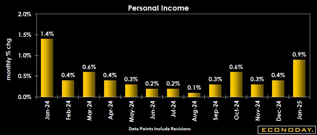 Personal income is up 0.9 percent in January from December, well above the consensus of up 0.3 percent in the Econoday survey of forecasters. The increase reflects a 0.4 percent rise in wages and salaries, which is more in line with market expectations. There are larger increases in other types of income. Personal dividend income is up 1.7 percent. Government social benefits are up 1.8 percent in January, mainly from a 2.8 percent cost of living adjustment for social security. Rental income is up 1.4 percent in January. Farm proprietors' income with inventory valuation and capital consumption adjustments jumps 39.3 percent in January, but accounts for a relatively small portion of overall income.