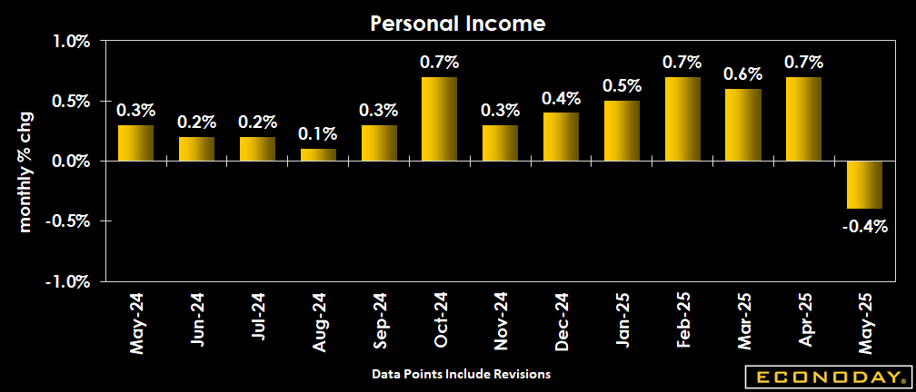 U.S. personal income fell 0.4 percent in May, partially erasing a 0.7 percent increase in April (revised from +0.8 percent) and far below expectations for a 0.3 percent rise in the Econoday survey of forecasters.