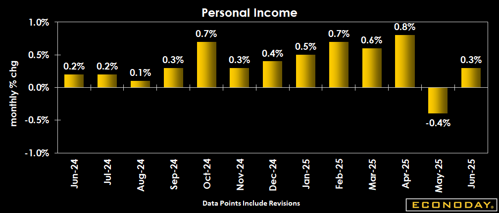 In June, personal consumption expenditures are up 0.3 percent from the prior month after a decline of 0.4 percent in May. The rise in June is above the consensus of up 0.2 percent in the Econoday survey of forecasters. However, wages and salary gains slow to up 0.2 percent in June after up 0.4 percent in May. In part, the rise in in June is from a jump of 12.4 percent in farm proprietors' income with inventory valuation and capital consumption adjustments, a 1.9 percent increase in social security payments, and a rise of 1.9 percent in veterans' benefits. There is also a increase of 2.7 percent in unemployment insurance.
