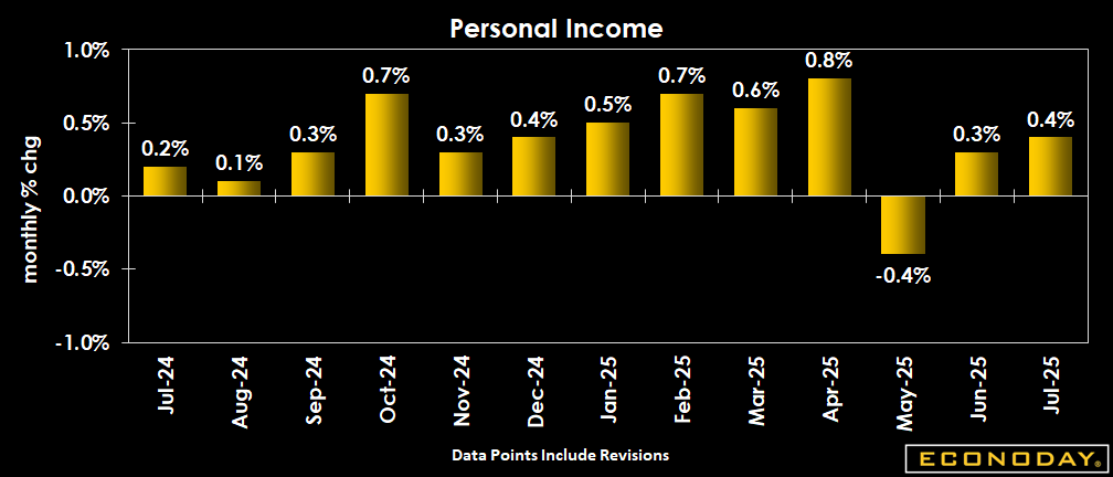 U.S. personal income rose 0.4 percent in July, building on a 0.3 percent increase in June and matching expectations in the Econoday survey of forecasters. Consumer spending, as measured by the Personal Consumption Expenditures (PCE) index, jumped 0.5 percent last month, following a revised 0.4 percent rise (previously +0.3 percent) in June. The increased spending on goods (+0.8 percent) was likely boosted by the extension of the July 9 pause on higher punitive global tariffs.