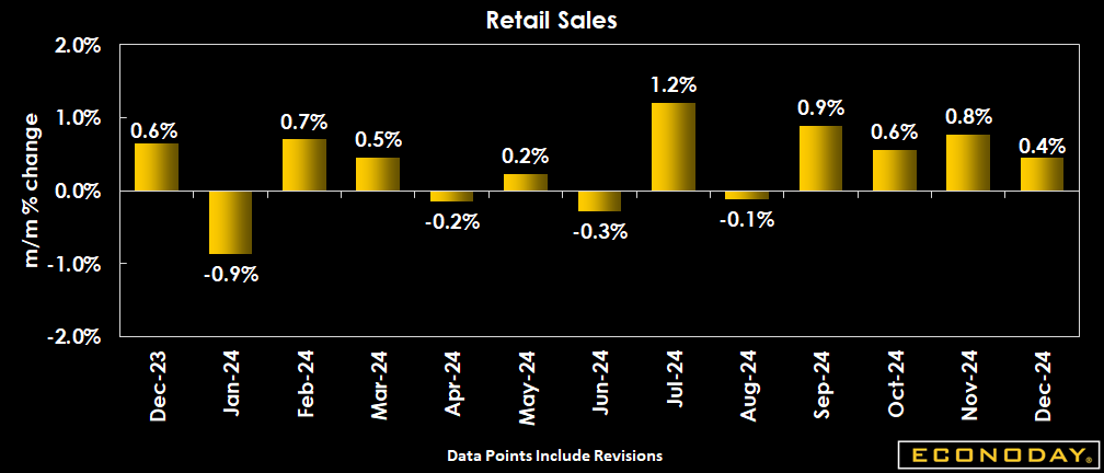 Retail and food services spending is up 0.4 percent in December after a small upward revision to up 0.8 percent in November. The increase is just below the consensus of up 0.5 percent in the Econoday survey of forecasters. As expected, spending was solid for motor vehicles and there was generally increased spending associated with the winter holidays in most other categories.