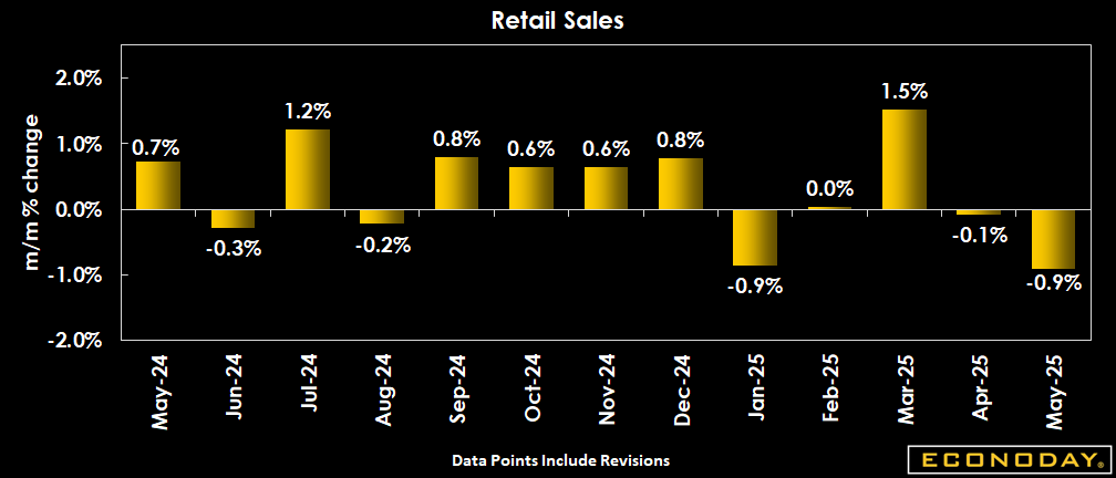 U.S. May retail sales declined by 0.9 percent, slowing down further from the revised 0.1 percent monthly drop reported for April (previously +0.1 percent), and greater than the -0.6 percent consensus in the Econoday survey of forecasters.