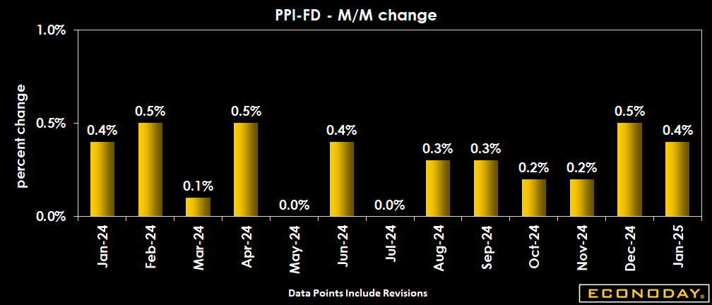 U.S. wholesale price inflation as measured by the Producer Price Index for final demand rose in January by 0.4 percent, following a revised 0.5 percent jump in December, and above expectations for a 0.3 percent rise in the Econoday survey of forecasters. Final demand prices advanced 0.2 percent in November and October.
