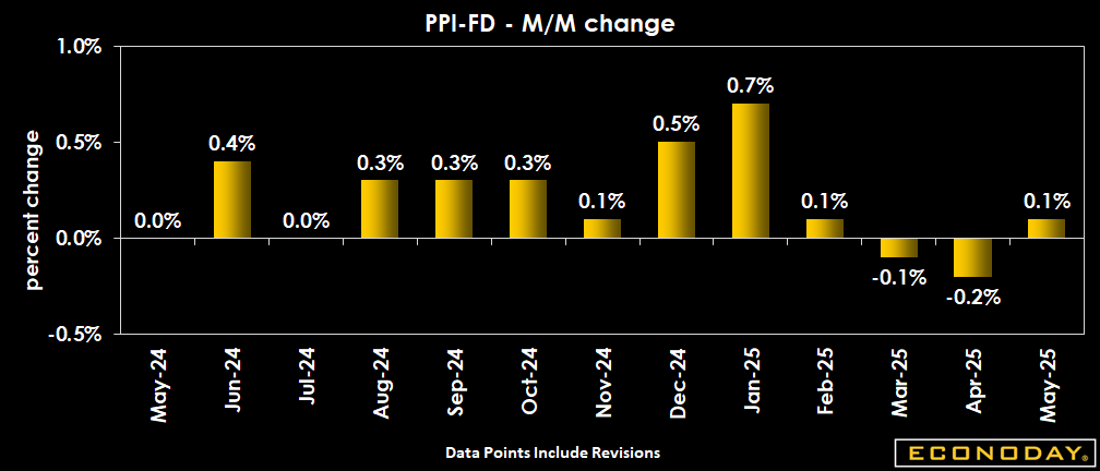 U.S. wholesale price inflation as measured by the Producer Price Index for final demand rose less than expected up 0.1 percent in May, following a 0.2 percent decline in April, and just below expectations for a 0.2 percent rise in the Econoday survey of forecasters. Final demand prices dipped 0.1 percent in March and saw a 0.1 percent uptick in February.