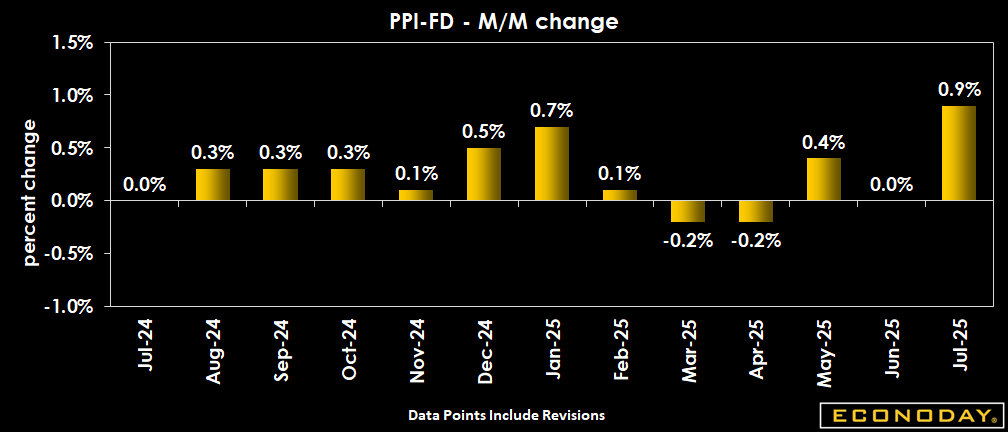 U.S. wholesale price inflation as measured by the Producer Price Index for final demand jumped 0.9 percent in July, following no change in June, and thrashing expectations for a 0.2 percent rise in the Econoday survey of forecasters. Final demand prices rose 0.4 percent in May and saw a 0.2 percent decline in April.