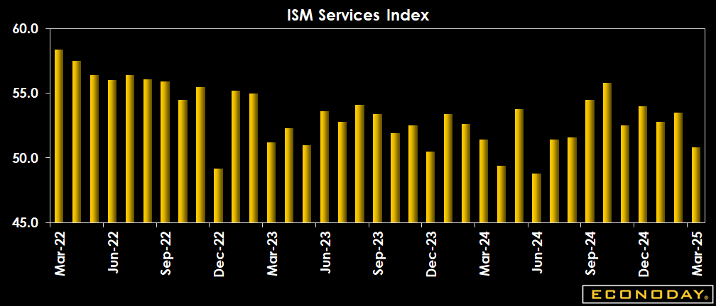 US ISM services fell back to a barely positive 50.8 in March from 53.5 in February, well below the 53.0 expected in the Econoday consensus. The report showed weakening in the three of four components that feed into the index -- new orders, employment and supplier deliveries. Employment was notably down and showed actual contraction at 46.2 versus 53.9 in February. ISM said tariffs are already hitting business as evident in the big drop of new export orders into contraction at 45.8 in March from 52.1 in February.