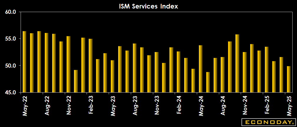 The ISM Services PMI fell to 49.9 in May, compared to the 51.6 recorded in April, and lower than the 52.0 expected in the Econoday survey of forecasters.
