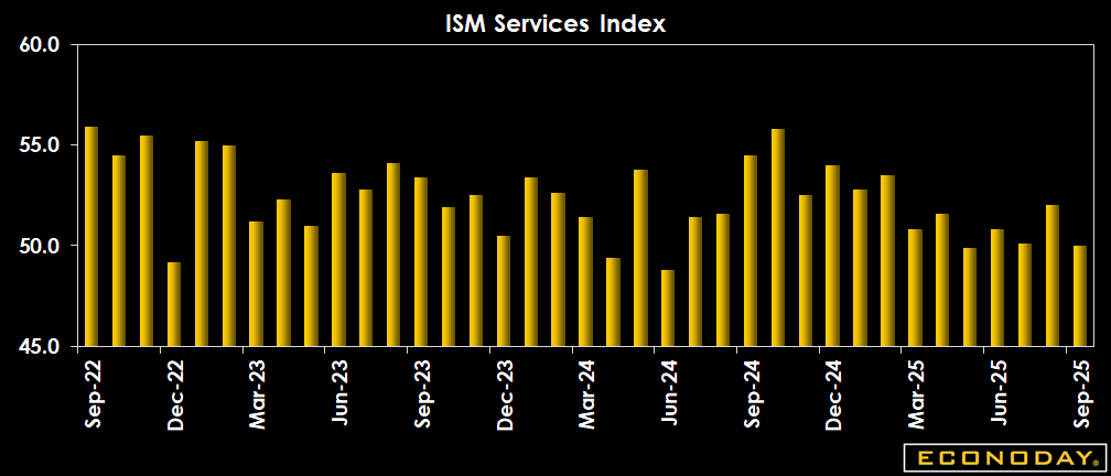 The ISM Services PMI dipped to 50.0 in September, down from the 52.0 recorded in August, and disappointing expectations for 51.6 in the Econoday survey of forecasters.