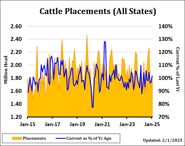 Placements for the month of January at 101.7% versus trade expectations of 102.7% and a range of 98.6% to 106.1%. Net placements were 1.76 million head. During January, placements of cattle and calves weighing less than 600 lbs. were 365,000 head, 600-699 lbs. were 395,000, 700-799 lbs. were 505,000, 800-899 lbs. were 382,000, 900-999 lbs. were 105,000, and 1,000+ lbs. were 70,000.