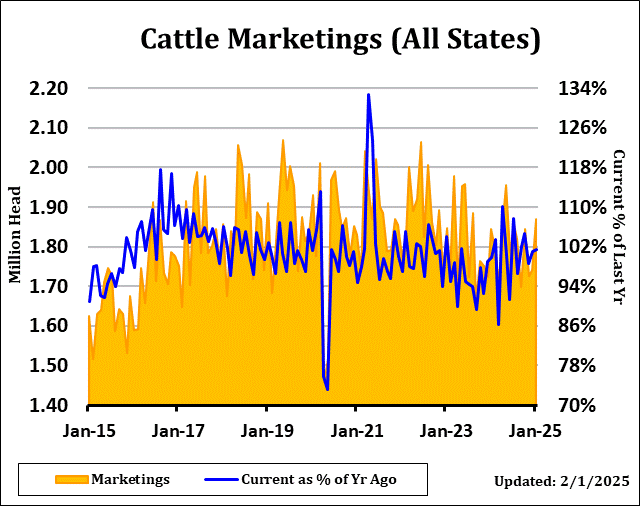 Marketings for January were 101.4% of last year, compared with the average estimate of 102.1% and a range of 101.3% to 102.5%. Other disappearance totaled 60,000 head during January, 26% below 2024.