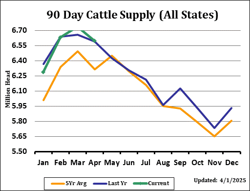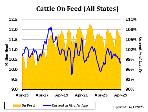 Cattle on Feed supply as of April 1st came in at 98.4% of last year versus the average trade estimate of 98.2% with a range of 97.5% to 99.2%. The inventory included 7.26 million steers and steer calves, down slightly from the previous year and accounting for 62% of the total inventory.
