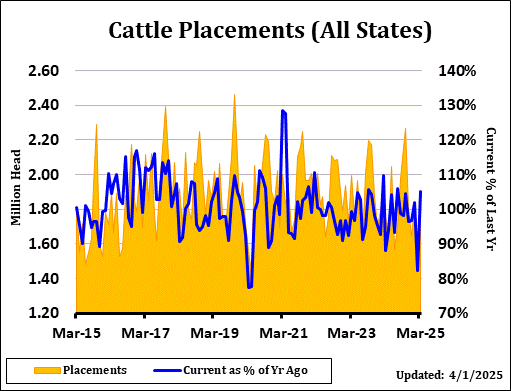 Placements for March were 105.1% versus trade expectations of 103.4% and a range of 99.0% to 106.7%. Net placements were 1.79 million head. Marketings for March were 101.1% of last year as compared with the average estimate of 100.6% and a range of 99.0% to 101.5%. Other disappearance totaled 55,000 head during March, 4% below last year.