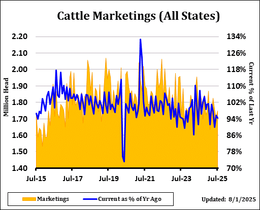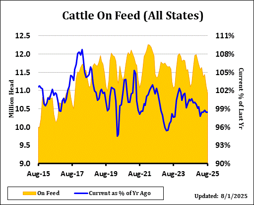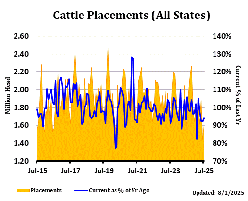 The USDA Cattle on Feed supply as of August 1st came in at 98.4% of last year, versus the average trade estimate of 98.1% with a range of 97.4% to 98.6%. Placements for July were 93.9% versus expectations of 91.0% and a range of 87.0% to 94.0%. Placements totaled 1.60 million head, 6 percent below 2024. Placements of cattle and calves weighing less than 600 pounds were 340,000 head, 600-699 pounds were 245,000 head, 700-799 pounds were 365,000 head, 800-899 pounds were 378,000 head, 900-999 pounds were 195,000 head, and 1,000 pounds and greater were 75,000 head. Markets were 94.3% versus the average estimate of 94.2% and a range of 93.9% to 94.7%.