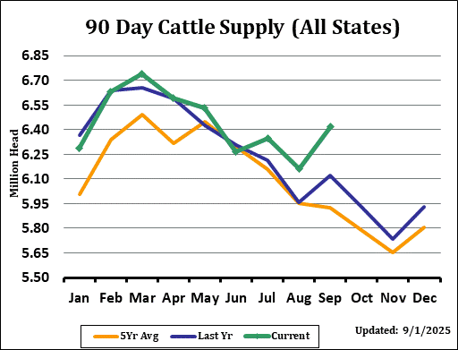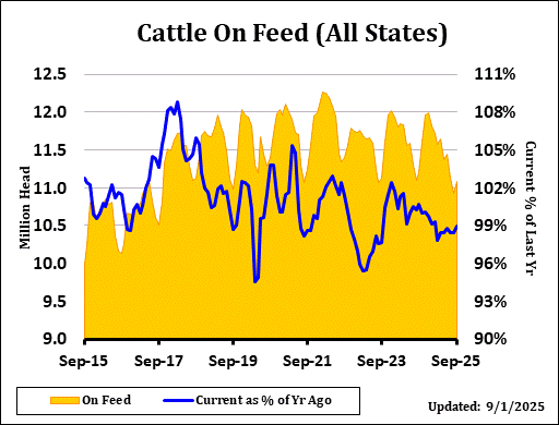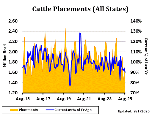 USDA Cattle on Feed supply as of September 1st came in at 98.9% of last year, versus the average trade estimate of 99.2% with a range of 98.7% to 99.9%. Placements for August were 90.1%, versus trade expectations of 91.5% and a range of 88.6% to 96.0%. Marketings for August came in at 86.4% of last year's level, compared with the average estimate of 87.0% and a range of 86.3% to 87.6%. Other disappearances totaled 51,000 head in August, 6% below 2024.