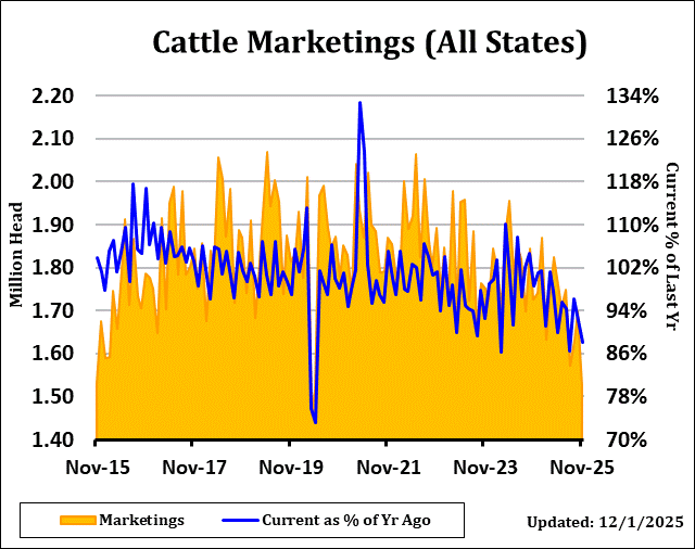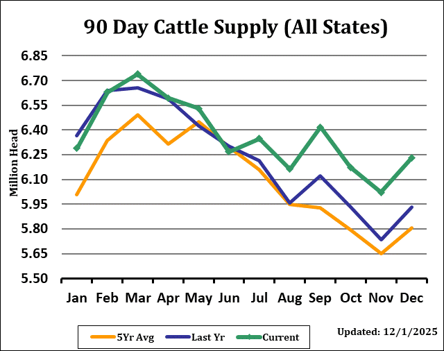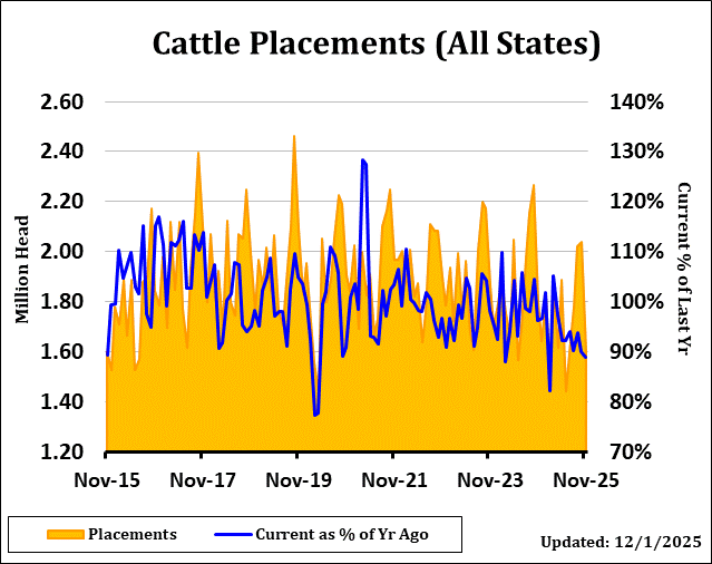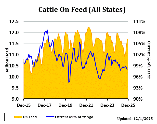 The USDA Cattle on Feed Report showed Cattle on Feed supply as of December 1st came in at 97.9% of last year, versus an estimate of 98.3% with a range of 97.3% to 99.3%. November placements were 88.8% versus expectations of 91.8% and a range of 84.4% to 98.3%. Marketings were 88.2% versus the average estimate of 88.5% and a range of 87.5% to 89.0%.