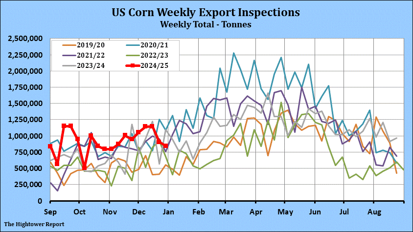 Corn export inspections for the week ending January 2 came in at 847,463 metric tonnes. Cumulative inspections year-to-date are 16,236,439 metric tonnes which is 24.5% above last year. This is 25.8% of the USDA's forecast for the 2024-25 marketing year versus the five year average of 21.1%.