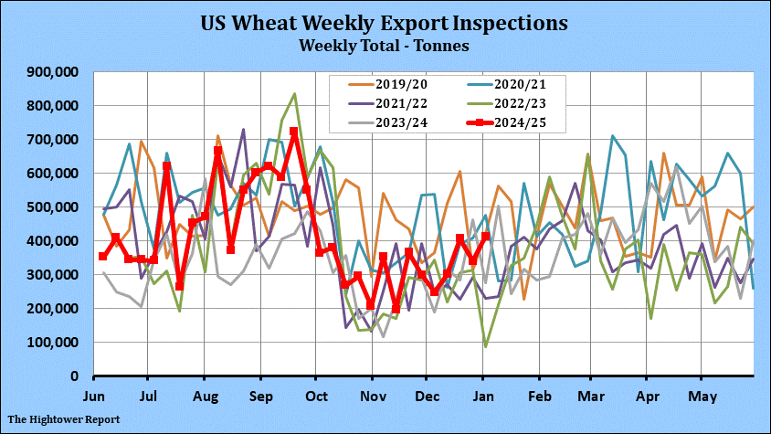 Wheat export inspections for the week ending January 2 came in at 412,342 metric tonnes. Cumulative inspections year-to-date are 12,717,752 metric tonnes which is 25.1% above last year. This is 55.0% of the USDA's forecast for the 2024-25 marketing year versus the five year average of 54.8%.