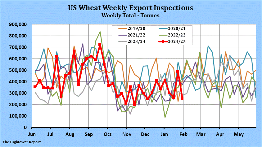 Wheat export inspections for the week ending January 30 came in at 252,637 metric tonnes. Cumulative inspections year-to-date are 14,027,826 metric tonnes which is 24.1% above last year. This is 60.6% of the USDA's forecast for the 2024-25 marketing year versus the five year average of 61.6%.