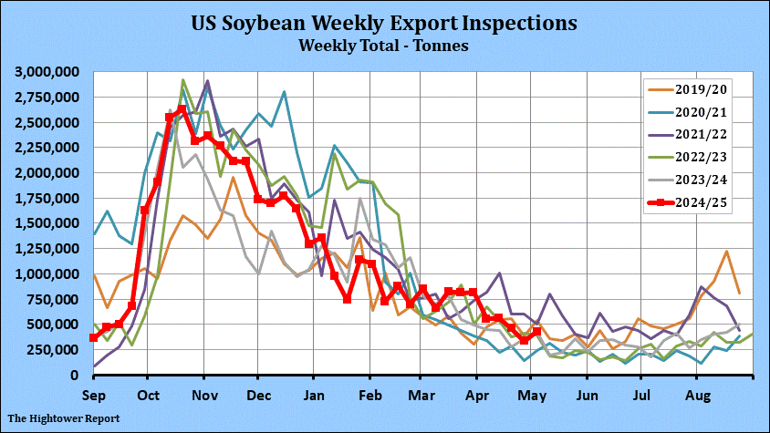 Soybean export inspections for the week ending May 8 came in at 426,077 metric tonnes. Cumulative inspections year-to-date are 43,898,598 metric tonnes which is 11.0% above last year. This is 88.4% of the USDA's forecast for the 2024-25 marketing year versus the five year average of 84.2%.