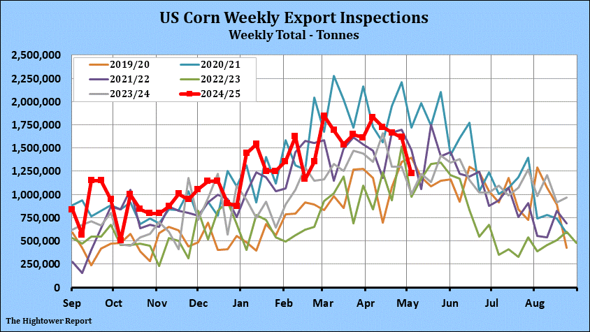 Corn export inspections for the week ending May 8 came in at 1,224,087 metric tonnes. Cumulative inspections year-to-date are 43,748,038 metric tonnes which is 28.6% above last year. This is 67.5% of the USDA's forecast for the 2024-25 marketing year versus the five year average of 59.6%.