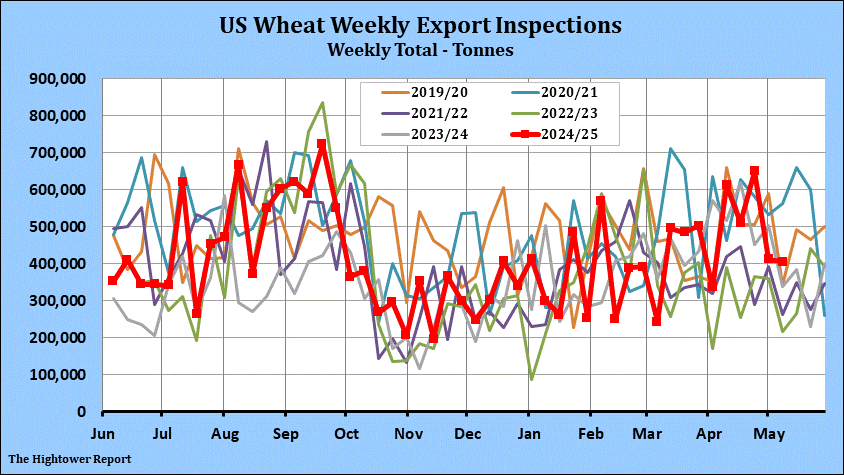 Wheat export inspections for the week ending May 8 came in at 405,170 metric tonnes. Cumulative inspections year-to-date are 20,278,735 metric tonnes which is 14.8% above last year. This is 90.9% of the USDA's forecast for the 2024-25 marketing year versus the five year average of 88.6%.