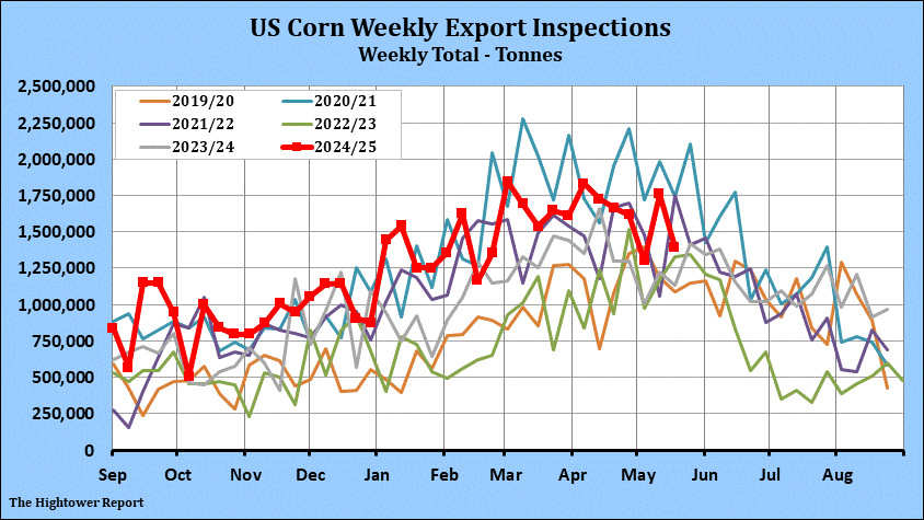 Corn export inspections for the week ending May 22 came in at 1,396,206 metric tonnes. Cumulative inspections year-to-date are 46,980,702 metric tonnes which is 29.1% above last year. This is 71.1% of the USDA's forecast for the 2024-25 marketing year versus the five year average of 64.6%.
