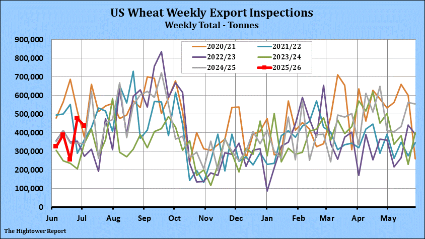 Wheat export inspections for the week ending July 3 came in at 436,628 metric tonnes. Cumulative inspections year-to-date are 1,758,177 metric tonnes which is 1.5% above last year. This is 7.8% of the USDA's forecast for the 2025-26 marketing year versus the five year average of 7.5%.