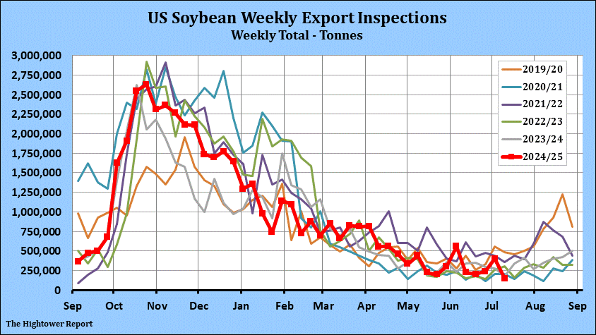 Soybean export inspections for the week ending July 10 came in at 147,045 metric tonnes. Cumulative inspections year-to-date are 46,411,264 metric tonnes which is 10.4% above last year. This is 91.4% of the USDA's forecast for the 2024-25 marketing year versus the five year average of 89.6%.