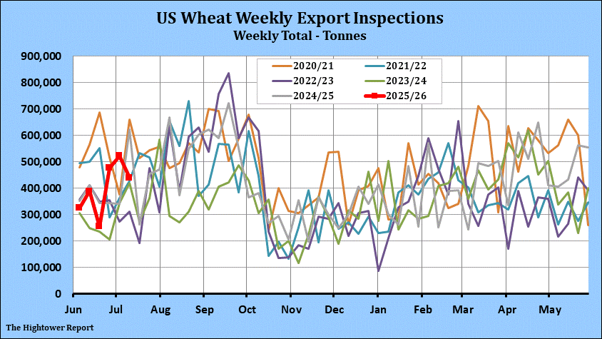Wheat export inspections for the week ending July 10 came in at 439,533 metric tonnes. Cumulative inspections year-to-date are 2,283,316 metric tonnes which is 3.0% below last year. This is 9.9% of the USDA's forecast for the 2025-26 marketing year versus the five year average of 9.8%.