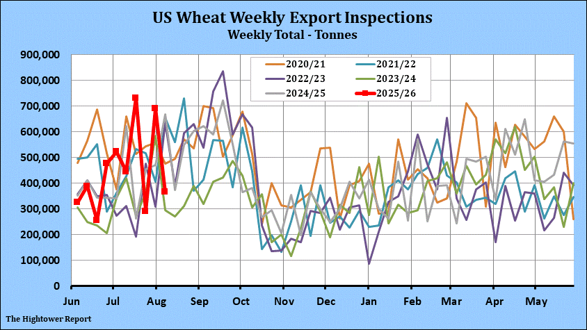 Wheat export inspections for the week ending August 7 came in at 365,486 metric tonnes. Cumulative inspections year-to-date are 4,366,891 metric tonnes which is 2.4% above last year. This is 18.9% of the USDA's forecast for the 2025-26 marketing year versus the five year average of 18.1%.