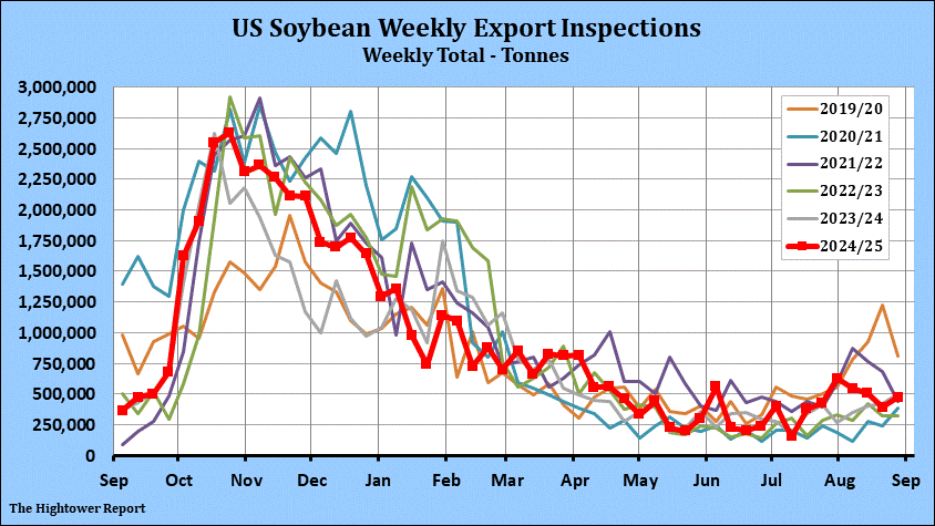 Soybean export inspections for the week ending August 28 came in at 472,914 metric tonnes. Cumulative inspections year-to-date are 49,763,188 metric tonnes which is 11.3% above last year. This is 97.5% of the USDA's forecast for the 2024-25 marketing year versus the five year average of 95.8%.