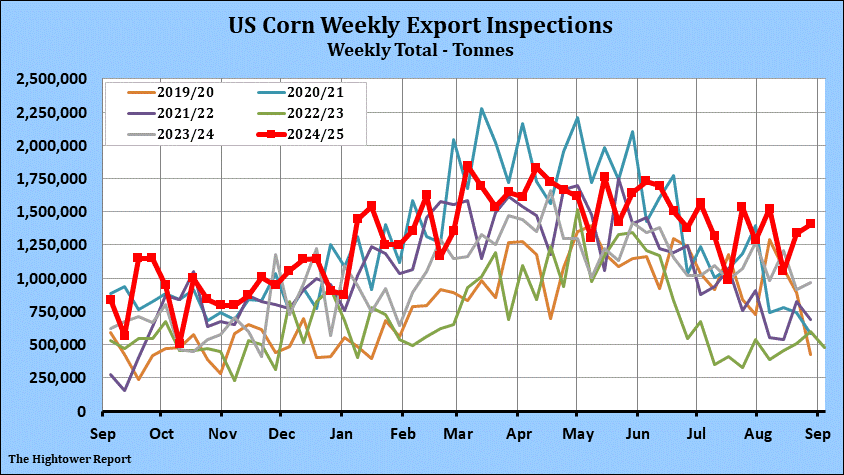 Corn export inspections for the week ending August 28 came in at 1,407,050 metric tonnes. Cumulative inspections year-to-date are 66,966,158 metric tonnes which is 28.6% above last year. This is 93.5% of the USDA's forecast for the 2024-25 marketing year versus the five year average of 90.3%.