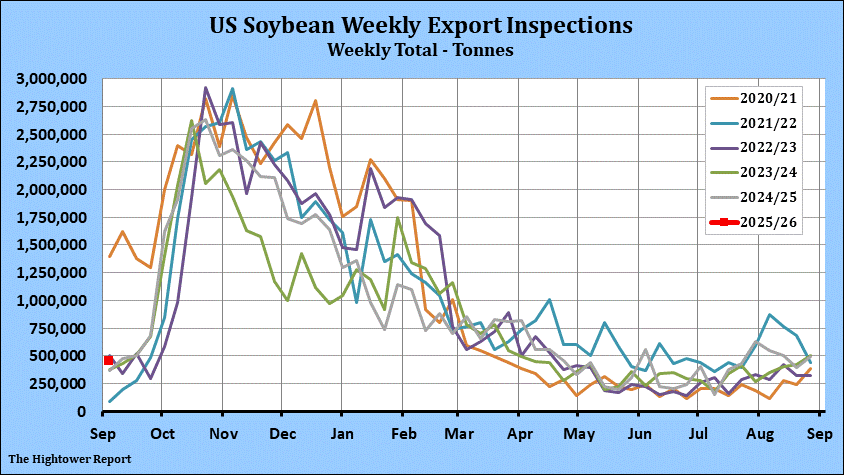 Soybean export inspections for the week ending September 4 came in at 452,151 metric tonnes. Cumulative inspections year-to-date are 248,575 metric tonnes which is 9.1% below last year. This is 0.5% of the USDA's forecast for the 2025-26 marketing year versus the five year average of 0.4%.